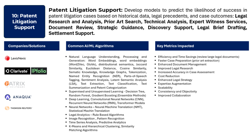 Predictive Analytics: Forecasting case outcomes, litigation risks, or potential settlement scenarios. Predicting the likelihood of success in a patent litigation case based on historical data and case-specific factors. Pattern Recognition: Identifying patterns in legal documents, patent claims, or prior art. Recognizing recurring elements that may strengthen or challenge legal arguments. Semantic Analysis: Understanding the meaning and context of legal language. Enhancing the precision of searches, identifying semantic relationships between legal terms. Supervised Machine Learning: Training models using labeled data to make predictions or classifications. Predicting outcomes, classifying legal documents, and providing support in decision-making processes. Legal Analytics: Analyzing legal data to derive insights into case strategies, judge behavior, and litigation trends. Providing data-driven insights for case assessment, strategy development, and decision-making. Document Similarity and Clustering: Identifying similarities between legal documents and clustering related documents. Grouping similar patents, prior art, or legal cases for efficient analysis. Predictive Coding for E-Discovery: Automating the review and categorization of documents in e-discovery. Accelerating the identification of relevant documents during the discovery phase of patent litigation. Expert Systems: Incorporating expert knowledge into rule-based systems.Developing systems that emulate the decision-making processes of legal experts, providing guidance in complex legal scenarios.