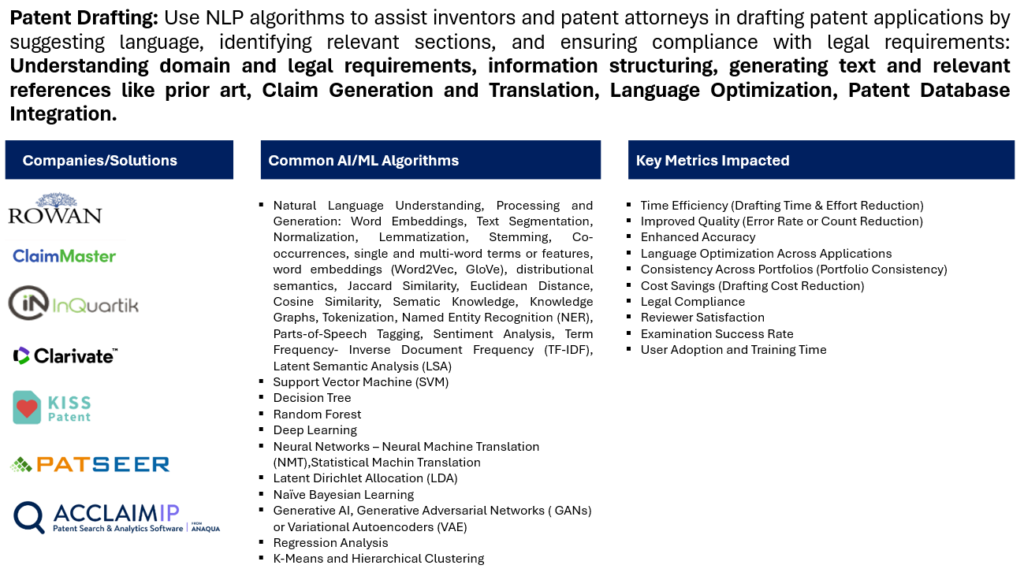 AI and ML algorithms are being employed in various ways to assist in drafting patents. The specific algorithms used may vary depending on the functionalities required by the patent drafting tools or platforms: Natural Language Processing (NLP): Understanding and processing human language in the patent documents. Tokenization, Named Entity Recognition (NER), Part-of-Speech Tagging, Sentiment Analysis. Applications: Analyzing patent claims, understanding technical language, and improving the clarity of patent descriptions. Machine Translation: Translating technical documents or prior art from one language to another. Neural Machine Translation (NMT), statistical machine translation. Applications: Facilitating cross-border collaboration and ensuring understanding of foreign language patents. Text Mining and Information Retrieval: Extracting relevant information from large sets of text data. TF-IDF (Term Frequency-Inverse Document Frequency), Latent Semantic Analysis (LSA), Word Embeddings (e.g., Word2Vec, GloVe). Prior art search, extracting relevant information from patent databases, and identifying key concepts. Predictive Analytics: Predicting outcomes, trends, or potential issues related to patent applications. Regression analysis, Decision Trees, Random Forest, Support Vector Machines (SVM). Predicting patent grant outcomes, assessing the likelihood of patent infringement or litigation.